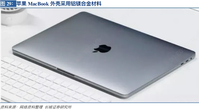 3C领域是镁合金及铝镁合金另一重要应用领域,通常被用于中高档超薄型或尺寸较小的笔记本的外壳,如MacBook外壳就采用铝镁合金材质,其中94%的成分为铝,镁占据5%。
