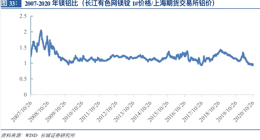 当前镁铝比跌破1 经济效益有望进一步打开镁市场应用空间:由于镁、铝性质类似,两者在应用领域存在一定的替代关系,历史上镁消费量的变化趋势很大程度上由铝、镁价格性价比来决定。2004-2007年镁价低于铝价,因此2007年镁消费量表现乐观;然而2008年镁价的大起大落以及产业发展的不成熟严重制约下游合金加工企业的应用。随着国家节能减排要求的不断提升,电价推升电解铝成本也大幅上涨,而镁行业在竖罐还原、稀土镁合金等技术推广后耗能、成本均不断下降,镁系产品利润优势逐渐显现。由于镁的密度(1.8/cm3)比铝(2.7/cm3)轻1.5倍,当前镁铝比维持低位利于镁对铝的应用替代。从长远来看,经济效益有望进一步打开镁市场应用空间。