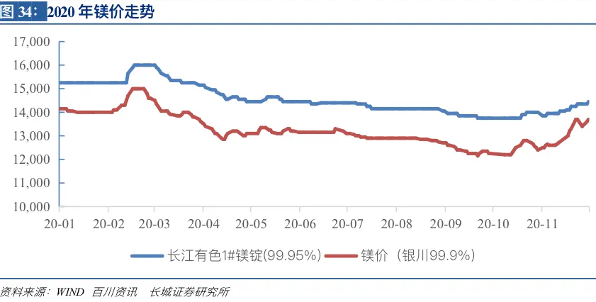 10月镁价自底部步入上涨周期以来,长江有色1#镁锭价格上涨700元/吨,原镁价格(银川99.9%)上涨1500元/吨,涨幅达到12.3%。随着海外汽车行业摆脱疫情影响复苏,镁下游订单不断增加,同时成本端对镁价形成底部支撑,镁价格有望持续上涨。
