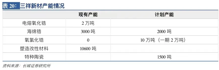 目前三祥新材拥有电熔氧化锆2万吨,海绵锆3000吨,塑性改造材料10600吨。辽宁华锆二期项目仍有2000吨海绵锆计划产能,辽宁华祥规划产能10万吨氧氯化锆,其中一期2万吨产能在建。