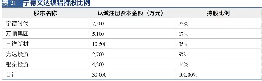 布局镁铝合金领域:2020年8月26日公司发布,拟与宁德时代新能源科技股份有限公司、江苏万顺机电集团有限公司、中山市隽达股权投资管理企业、中山银泰股权投资管理企业共同投资镁铝合金项目,实施主体暂定名为宁德文达镁铝科技有限公司,注册资本为30,000万元,宁德时代、万顺集团、三祥新材、隽达投资、银泰投资按25%;17%;35%;9%;14%的比例共同投资。项目合作的产品为镁铝合金,总投资额3亿元。