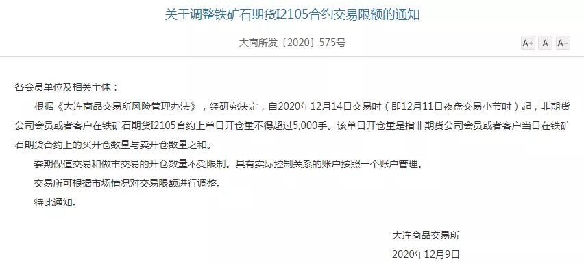 早在12月9日,大商所发布了“关于调整铁矿石期货I2105合约交易限额的通知”,决定自2020年12月14日交易时(即12月11日夜盘交易小节时)起,非期货公司会员或者客户在铁矿石期货I2105合约上单日开仓量不得超过5000手。该单日开仓量是指非期货公司会员或者客户当日在铁矿石期货合约上的买开仓数量与卖开仓数量之和。
