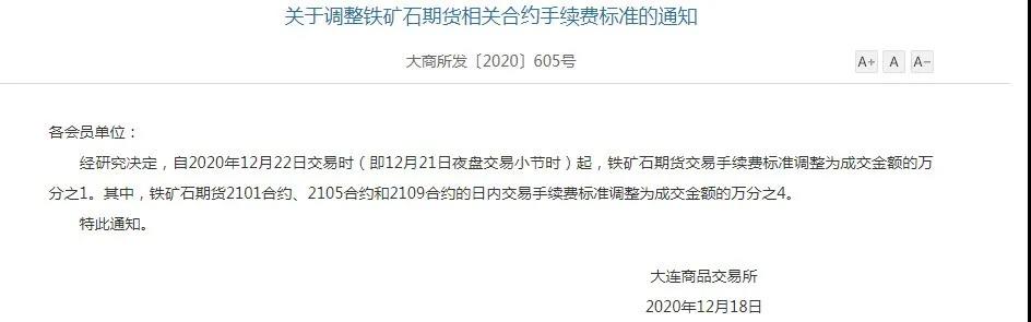 12月18日,大商所发布“关于调整铁矿石期货相关合约手续费标准的通知”,决定自2020年12月22日交易时(即12月21日夜盘交易小节时)起,铁矿石期货交易手续费标准调整为成交金额的万分之一。其中,铁矿石期货2101合约、2105合约和2109合约的日内交易手续费标准调整为成交金额的万分之四。