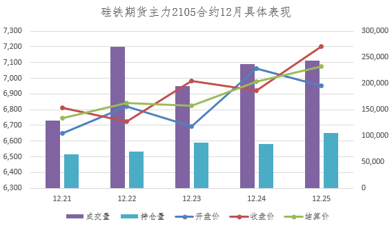 【期货】本周硅铁期货2105主力合约表现强劲。周开盘6,650,最高价7,200,最低价6,610,收盘价7,200,结算价7,076,成交量1,076,700,持仓量106,026,涨幅10.84%。
