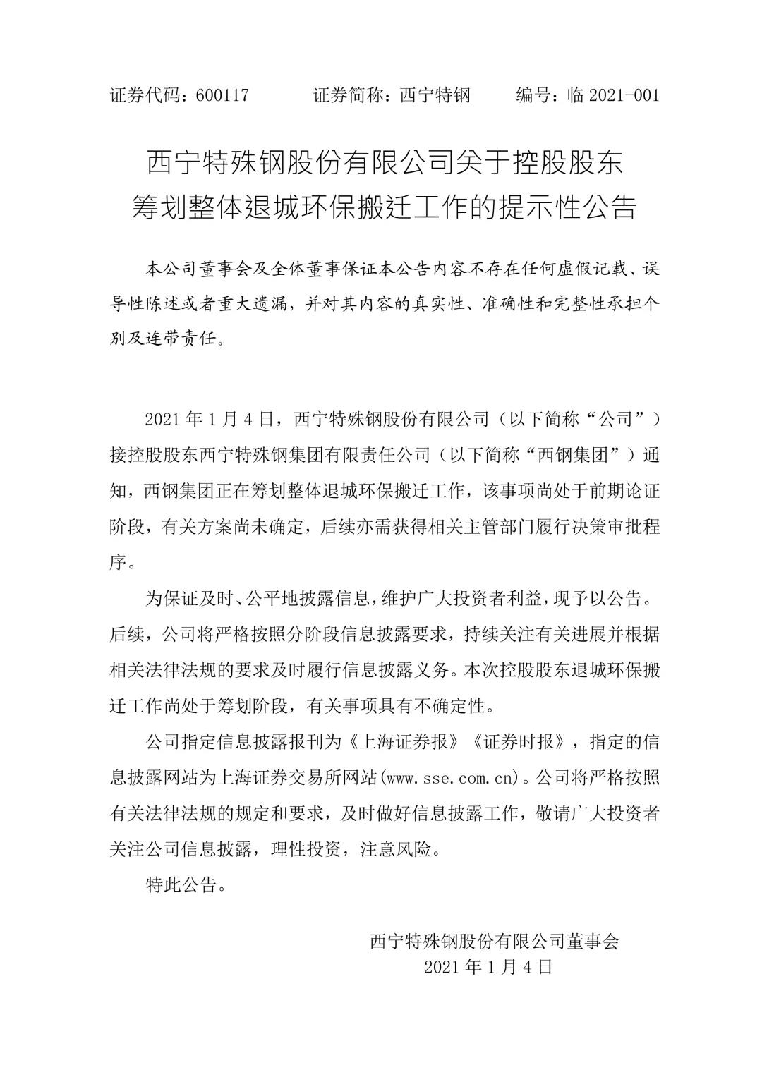日前,西宁特殊钢股份有限公司(以下简称“公司”)接控股股东西宁特殊钢集团有限责任公司通知,西宁特钢正在筹划整体退城环保搬迁工作,该事项尚处于前期论证阶段,有关方案尚未确定,后续亦需获得相关主管部门履行决策审批程序。