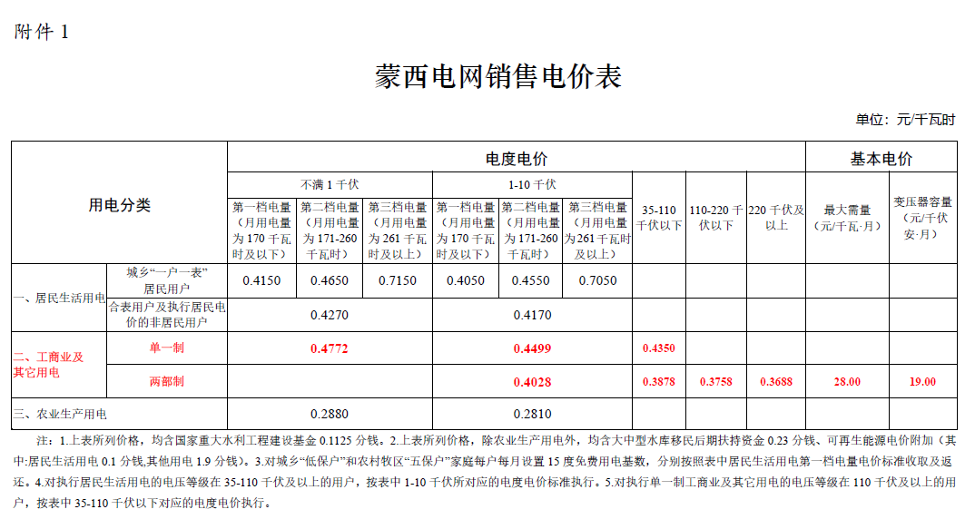 中国铁合金网讯:年底内蒙古发改委会发布关于蒙西电网2020-2022年输配电价和销售电价有关事项的通知,具体工商业用电如下所示,通知自2021年1月1日起执行,其中文件显示降低蒙西电网工商业及其他用电目录销售电价。单一制不满1千伏、1-10千伏、35-110千伏目录销售电价每千瓦时分别降低3.12分、2.45分、1.78分;两部制各电压等级目录销售电价每千瓦时均降低4.5分,具体电价如下所示: 单位:元/千瓦时