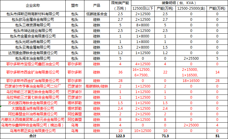 中国铁合金网讯:日前内蒙地区高能耗限制类企业名单(第一批)流出,涉及硅铁相关企业21家(其中在产19家,技改1家,检修1家,已停产企业暂未计算在内);涉及产能122.3万吨(其中12500KVA及以下炉型71.3万吨,12500-25000KVA(含)炉型51万吨)。