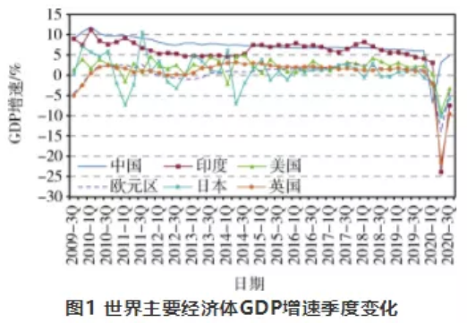 按季度来看,受到疫情影响,世界经济在2020年第二季度出现断崖式下跌,主要发达经济体美国、欧元区、日本经济同比分别下降9.0%、13.9%和10.2%,英国经济甚至出现21.5%的降幅;第三季度,由于疫情有所好转,主要发达经济体降幅减小,美国、欧元区和日本经济降幅分别收窄3.3%、4.2%和5.8%。受到年初疫情爆发影响,中国经济在第一季度下降了6.8%,第二季度开始恢复增长,增幅为3.2%,第三季度回升至4.9%。受疫情冲击,印度经济从第一季度的增长3.1%骤降至-23.9%,第三季度收窄至萎缩7.5%(图1)。
