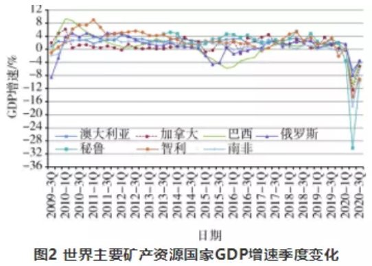 在主要矿产资源国中,秘鲁、南非、智利经济萎缩最为严重,延续2019年以来的国内动乱,叠加疫情影响,使得经济大幅下滑。2020年第二季度秘鲁经济萎缩达30.2%(图2)。俄罗斯、巴西、澳大利亚和加拿大也呈现同样的走势,不过降幅较小。