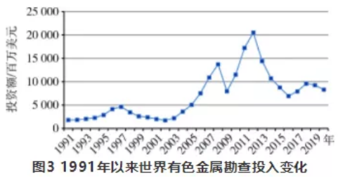 在提高国内关键矿产供应能力政策影响下,美国勘查投入大幅上升。据标普全球市场财智(S&P Global Market Intelligence)统计,美国2019年有色金属矿产勘查投资为9.45亿美元,创2014年以来的最高水平;2020年投资额为9.31亿美元,小幅下降。2020年钻探活动与2019年基本持平。2020年矿产勘探也取得一些进展,格朗德霍格(Groundhog)铜金矿、安特勒(Antler)铜矿获得新发现。