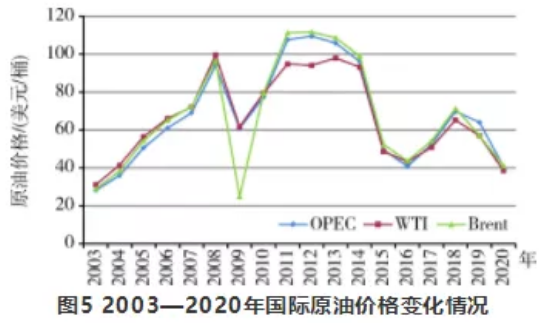 一年多来,受疫情封锁和隔离措施影响,全球交通运输业受限,原油消费下降,价格低迷。2020年欧佩克(OPEC)、西德克萨斯(WTI)和布伦特(Brent) 34原油均价分别为40.66美元/桶、38.56美元/桶和41.13美元/桶,较2019年分别下跌36.5%、32.3%和27.8%。2020年4月20日,WTI原油期货价格跌至-37.63美元/桶,为1983年以来纽约商品交易所引入石油期货以来首次出现负数交易(图5)。2021年,随着美国和欧盟疫情防控措施加强以及多数国家疫苗接种工作推进,交通运输等行业恢复,原油需求回升,其价格将进一步上涨。