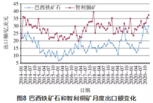 铁矿石、铜价大幅上涨,使得巴西、智利矿产品出口额大幅增长(图8),很大程度上弥补了疫情带来的负面影响。2020年,巴西铁矿石出口量为3.18亿t,较2019年的3.40亿t下降6.2%;出口额为248亿美元,较2019年的222亿美元增长11.5%。2020年,智利铜出口额为363亿美元,较2019年的336亿美元增长8.3%。