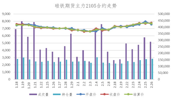 【期货行情】2月硅铁期货2105主力合约走高后下行。月开盘6,748,最高价7,998,最低价6,546,收盘价7,796,结算价7,712,成交量3,622,407,持仓量157,855。