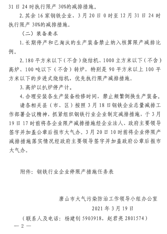 唐山松汀钢铁有限公司、唐山中厚板材有限公司、河北鑫达钢铁集团有限公司、唐山不锈钢有限责任公司、唐山市春兴特种钢有限公司、唐山金马钢铁集团有限公司、唐山东华钢铁企业集团有限公司(含凯恒)等7家钢铁企业,3月20日0时至6月30日24时执行限产50%的减排措施;7月1日0时至12月31日24时执行限产30%的减排措施。