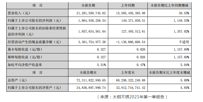 太钢不锈4月24日发布的报告显示,2020年第一季,其营业收入同环比分别增长约36.55%和11%至近212.816亿元,归属于上市公司股东的净利润同环比分别增长约1148.53%和180.5%至18.6493亿多元,归属于上市公司股东的扣除非经常性损益的净利润同环比分别增长约1357.02%和196.6%至18.5763亿多元,经营活动产生的现金流量净额达33.6175亿多元(同环比分别增加约44.9782亿元和9.9654亿元)。