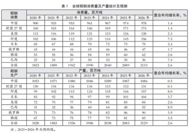 总的来说,预计全球钢铁生产将跟随全球工业生产的轨迹,在展望期的前两年增速相对更高。随后,伴随中国粗钢产量达到峰值,全球粗钢产量增速将放缓。全球粗钢消费量及产量统计与预测如表1所示。