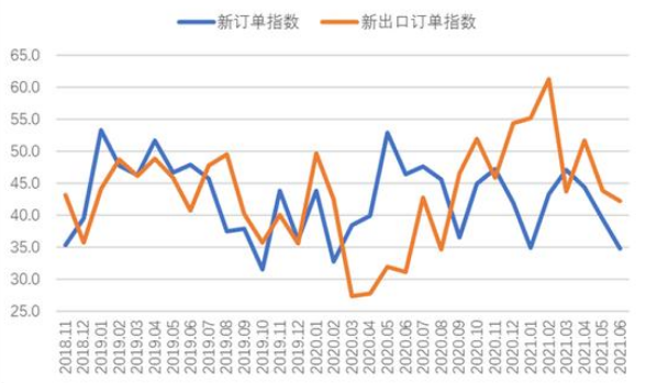 图2 2018年以来钢铁新订单和新出口订单指数变化情况