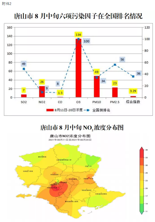 (二)主要污染因子。8月11日-20日,CO、NO2是唐山市的劣势因子,其中,CO浓度1.3mg/m3,全国倒8,全省倒2;NO2浓度26μg/m3,全国倒9,全省倒1(见附件2)。从PM2.5组分情况看,NO3-在PM2.5中占比接近50%,是拉高PM2.5浓度的主要成因,应持续加强钢铁、焦化、水泥及重型柴油车等NO2排放源的管控。