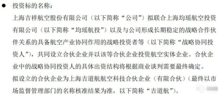 今年4月,均瑶集团旗下的吉祥航空公告称,公司与均祥海、均瑶航投及战略协同投资人共同设立吉道航,全体合伙人出资总额不超过300亿元人民币,用于投资航空实体企业。