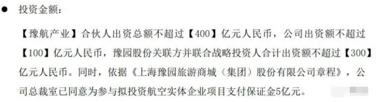 今年5月,A股公司豫园股份公告称,拟联合公司关联方、航空产业战略投资者等,共同设立合伙企业并以该等合伙企业投资航空实体企业。拟设立的合伙企业为豫园航空产业合伙企业(有限合伙)(暂称“豫航产业”),出资总额不超过400亿元,其中豫园股份出资额不超过100亿元。