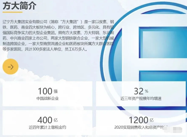 官网显示,辽宁方大集团是一家以炭素、钢铁、医药、商业四大板块为核心,跨行业、跨地区、多元化、具有较强国际竞争实力的大型企业集团。旗下除拥有上述4家上市公司,还拥有2家大型钢铁联合企业,1家大型机械制造跨国企业,1家大型商贸流通企业和医药板块所属方大群众医院等多家医院,共计300多家法人单位,员工6万多人。