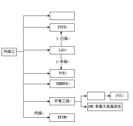 丙烯下游规划聚丙烯项目,并以聚丙烯、乙丙橡胶为原料生产市场前景好、附加值高的聚烯烃热塑性弹性体项目。另外,与外购苯资源结合,发展苯酚/丙酮项目。环氧丙烷是重要的有机化工原料,下游衍生精细化工产品丰富,其中碳酸二甲酯是非光气法聚碳酸酯的另一种主要原料。规划发展清洁工艺路线的过氧化氢环氧丙烷,下游延伸聚醚多元醇、碳酸二甲酯、聚氨酯项目。