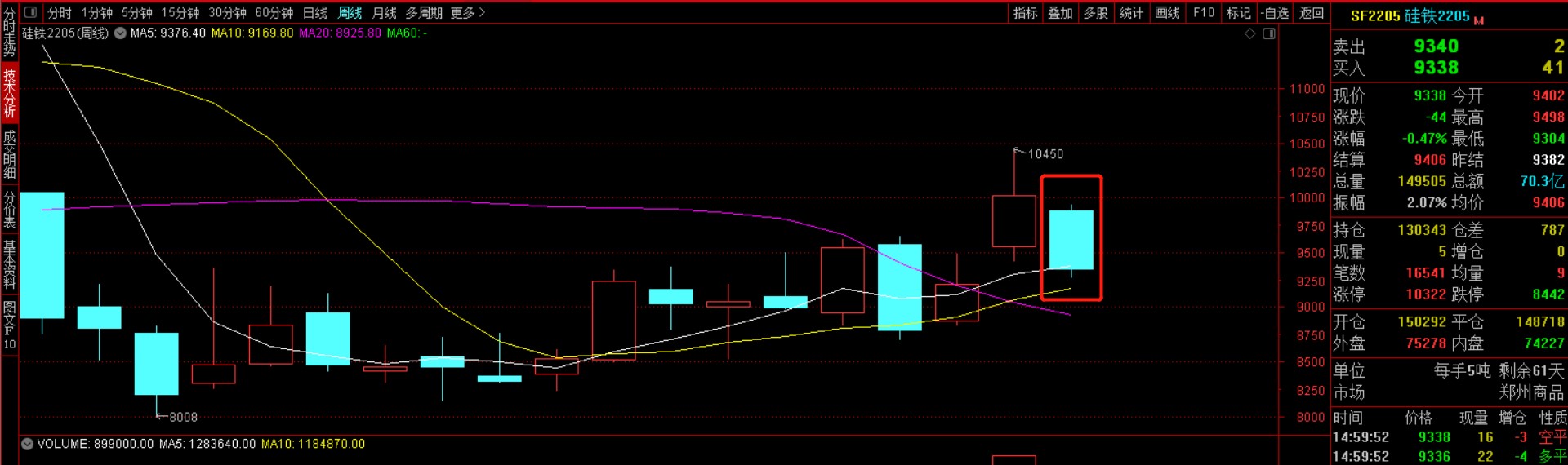本周2205主力合约开盘价9,880,最高价9,934,最低价9,260,收盘价9,338,结算价9,406,成交量899,014,持仓量130,343,涨幅-6.32%。