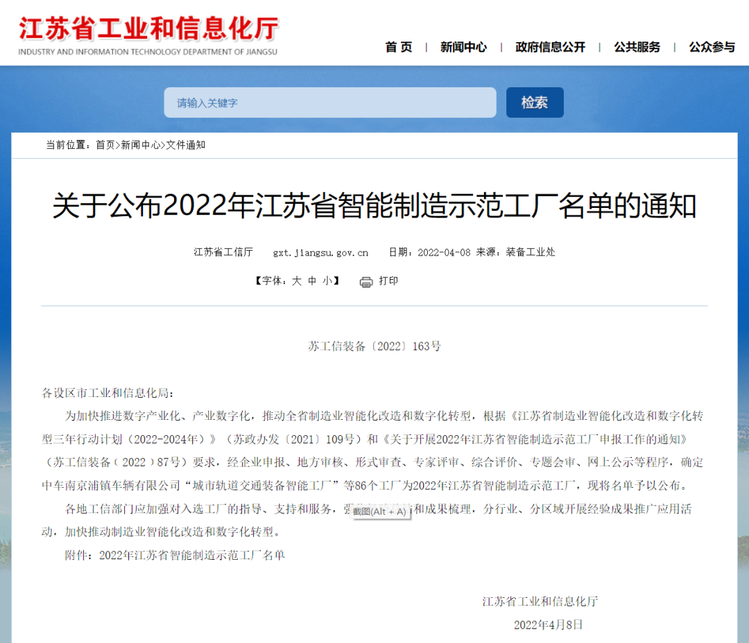 为加快推进数字产业化、产业数字化,推动全省制造业智能化改造和数字化转型,根据《江苏省制造业智能化改造和数字化转型三年行动计划(2022-2024年)》(苏政办发〔2021〕109号)和《关于开展2022年江苏省智能制造示范工厂申报工作的通知》(苏工信装备﹝2022﹞87号)要求,经企业申报、地方审核、形式审查、专家评审、综合评价、专题会审、网上公示等程序,确定中车南京浦镇车辆有限公司“城市轨道交通装备智能工厂”等86个工厂为2022年江苏省智能制造示范工厂,现将名单予以公布。