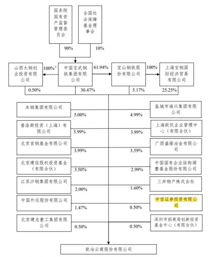 截至招股书签署日,中国宝武集团及旗下的宝钢国际、宝钢股份和太钢创投合计直接持有欧冶云商61.38%股份,是欧冶云商控股股东,国资委间接持有中国宝武90%股权,是欧冶云商实际控制人。