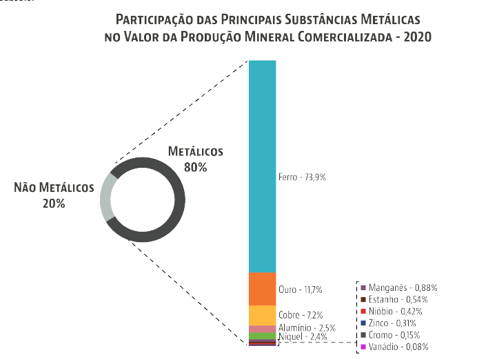 中国铁合金网:目前,有 37 种矿产金属在国家矿业局注册并获得研究和采矿权。2020年,金属矿产占巴西矿产总产值的80%左右。在金属矿产物质中,有11种金属脱颖而出,占该类产值的99.7%,即:铝、铜、铬、锡、铁、锰、铌、镍、金、钒和锌。这 11 种物质的产值总计 1935 亿雷亚尔,其中铁矿份额表现尤为突出,其生产主要集中在帕拉州和米纳斯吉拉斯州。因此,考虑到这 11 种金属物质在巴西矿产生产中的重要性,我们提供反映其在 2020 年全年表现的统计数据及巴西矿产资源分布,如需索要具体明细,请联系中铁合金网。