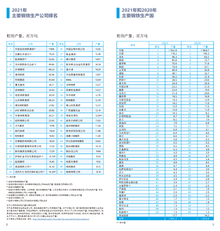 世界钢铁协会总干事埃德温•巴松在该期刊序言中提到:“尽管全球许多地方仍受到疫情的影响,但本期发布的数据显示,2021年全球大多数国家的钢铁产量和消费量都有明显增长。但是俄乌冲突的爆发和持续攀升的高通胀,动摇了人们对2022年及以后经济从大流行中持续、稳定复苏的期望。