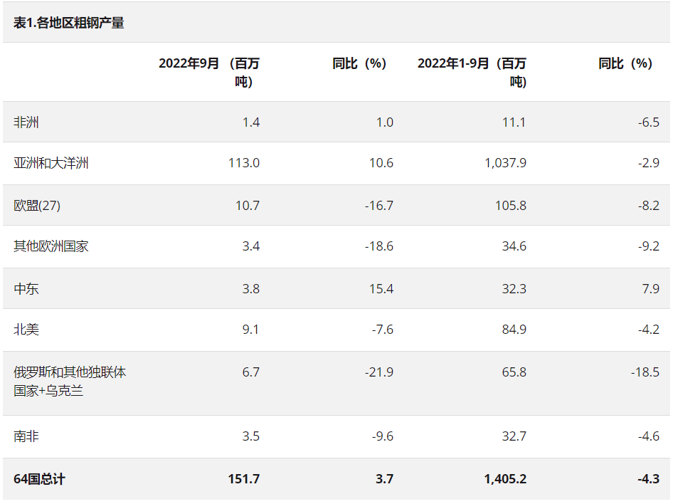 2022年9月,非洲粗钢产量为140万吨,同比提高1.0%;亚洲和大洋洲粗钢产量为1.130亿吨,同比提高10.6%;