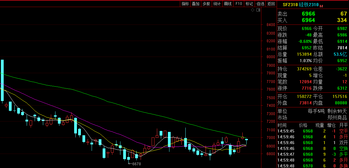 本周硅铁2310主力合约周开盘价6,906,最高价7,064,最低价6,764,收盘价6,966,结算价6,952,成交量1,015,496,持仓量374,269,跌幅0.20%。