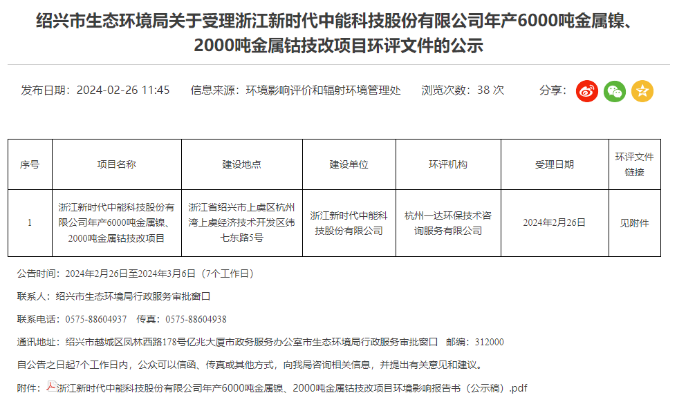2月26日,绍兴市生态环境局受理浙江新时代中能科技股份有限公司年产6000吨金属镍、2000吨金属钴技改项目环评文件并对外进行公告,公告时间:2024年2月26日至2024年3月6日(7个工作日)。
