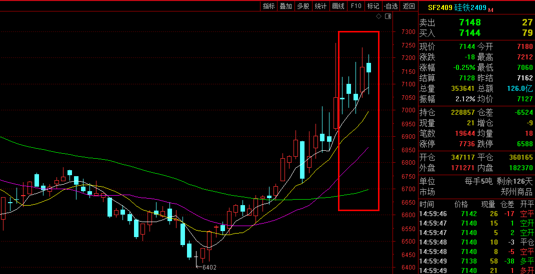 期货端:本周2409主力合约开盘价7046,最高价7240,最低价6984,收盘价7144,结算价7128,持仓量228857,成交量1901846,成交金额675.691亿元,涨幅0.48%。