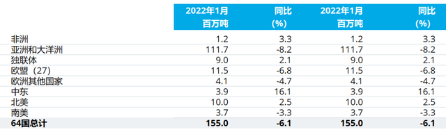 世界钢铁协会发布2022年1月全球粗钢产量数据显示,2022年1月全球64个纳入世界钢铁协会统计国家的粗钢产量为1.550亿吨,同比下降6.1%。 |