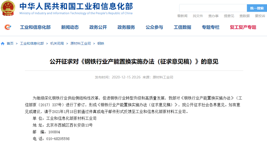 工信部对钢铁行业产能置换征求意见 这些重点区域严禁增加钢铁产能总量(附文件全文)