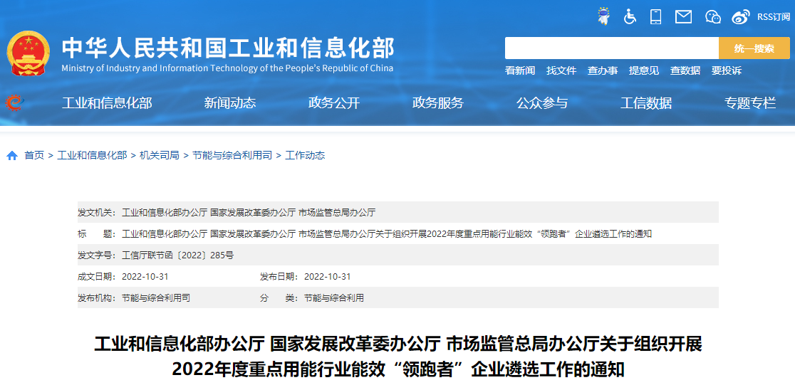 关于组织开展2022年度重点用能行业能效“领跑者”企业遴选工作的通知