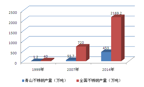 1999年,全国不锈钢产量为40万吨,其中,青山不锈钢产量占3%;2007年全国不锈钢产量为720万吨,,其中,青山不锈钢产量占8%;到2014年,全国总产量2169.2万吨,其中,青山不锈钢占21%。预计到2020年,青山钢铁产量将达到1000万吨。 |