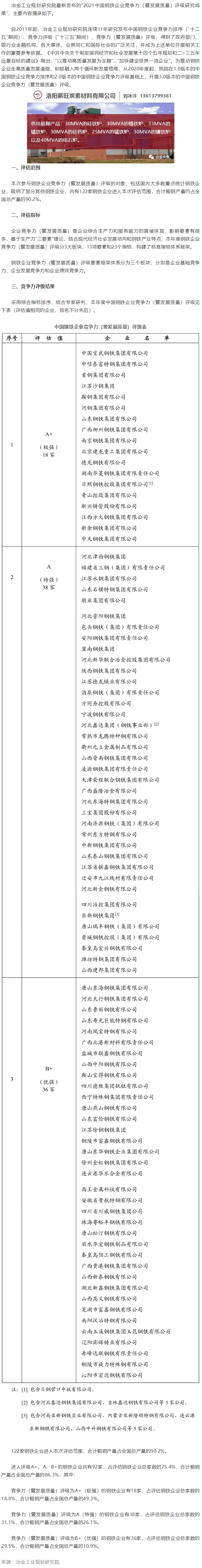 冶金工业规划研究院最新发布的“2021中国钢铁企业竞争力(暨发展质量)评级研究成果”,122家钢铁企业进入本次评估范围,合计粗钢产量占全国总产量的90.2%。 |
