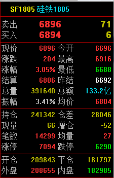 中国铁合金网讯:1月18日,期货硅铁1805合约收盘6896,涨幅3.05%,结算价6806,今日开盘价6696,最高价6916,最低价6688,成交量391640手,持仓量241342。 |