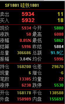 中国铁合金网讯:2017年10月10日15点硅铁期货硅铁主力1801收盘5934.0,涨幅0.71%,结算价5996.0,成交306686手;