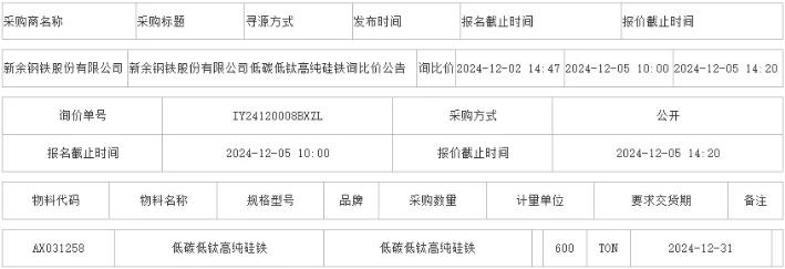 12月新余钢铁低碳低钛高纯硅铁招标公告。