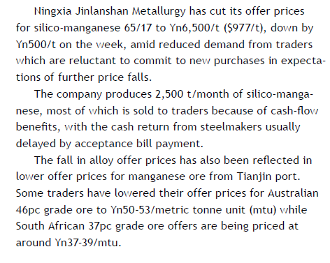 硅锰:宁夏金兰山硅锰报价下调500元/吨