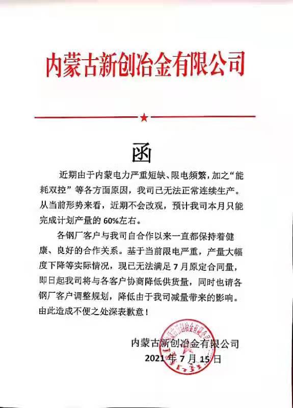 内蒙古新创冶金7月产量预计缩减40%左右。