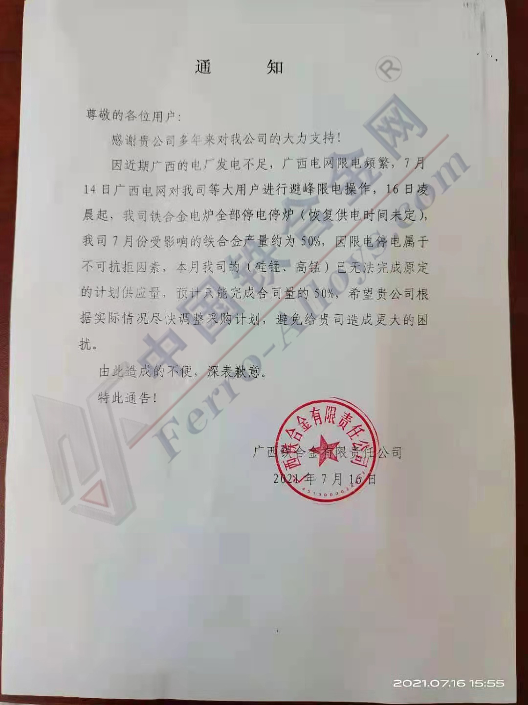 广西铁合金有限公司停电停炉预计影响产量约50%。