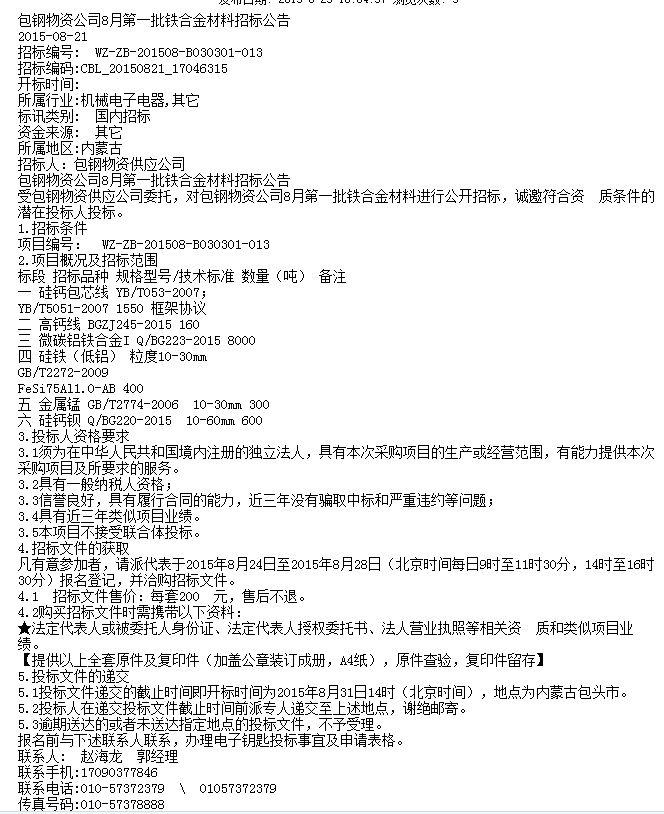 鞍钢集团矿业公司2015年9-12月份铁合金招标公告。 其中,高碳锰铁-FeMn63招标80吨,高碳铬铁-FeCr55C600 招标350吨,低磷锰铁-FeMn78C8.0 招标135吨,中碳锰铁-FeMn78C2.0 招标160吨,硅铁-FeSi75A11.0-A112吨........ |