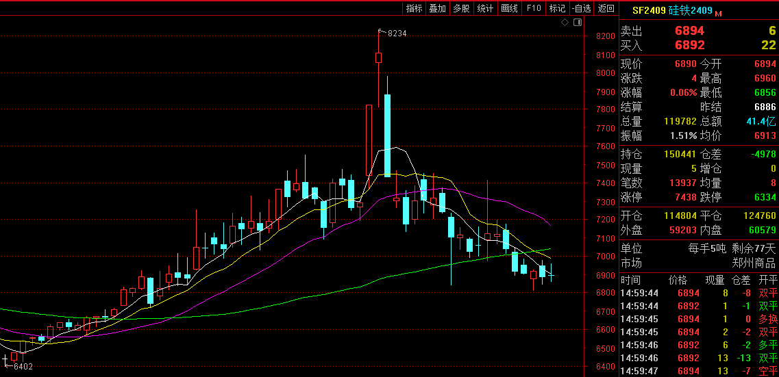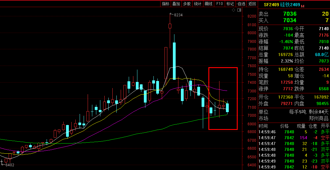 7月5日硅铁期货盘面下跌1.74% 收盘6894