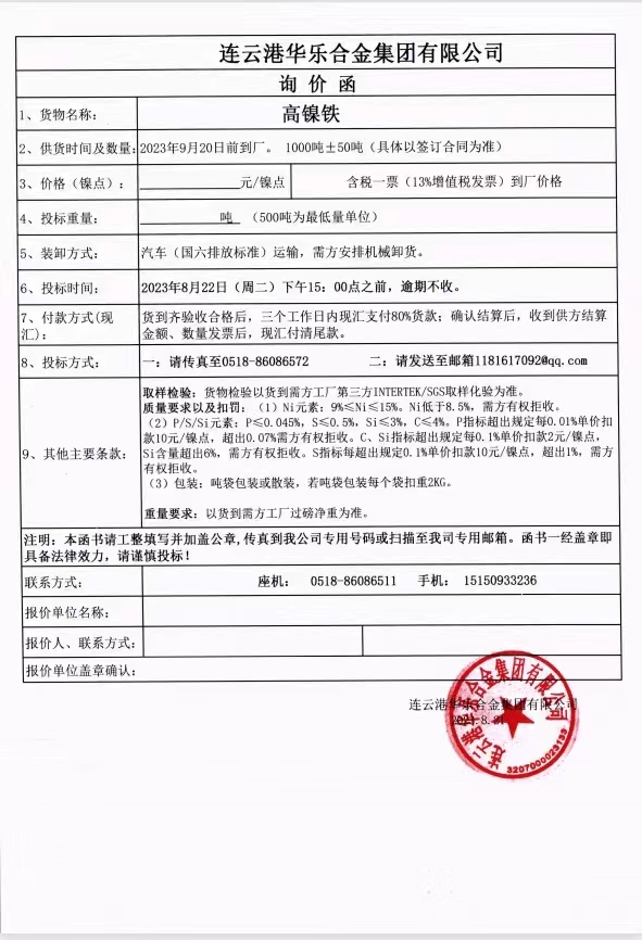 连云港华乐合金集团发布招投标(高镍铁)公告,投标时间2023年8月22日下午15:00之前,要求9月20日前到厂。详细内容请参考下方询价函。 |