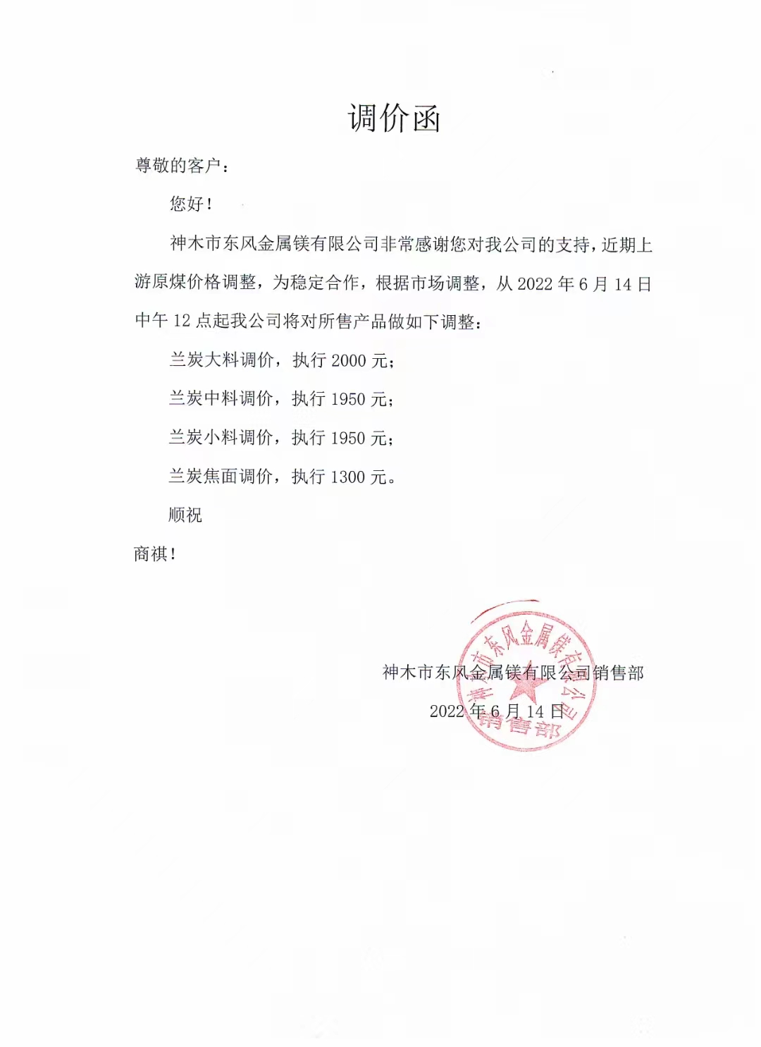 神木市东风金属镁公司调整兰炭价格 小料1950元/吨。